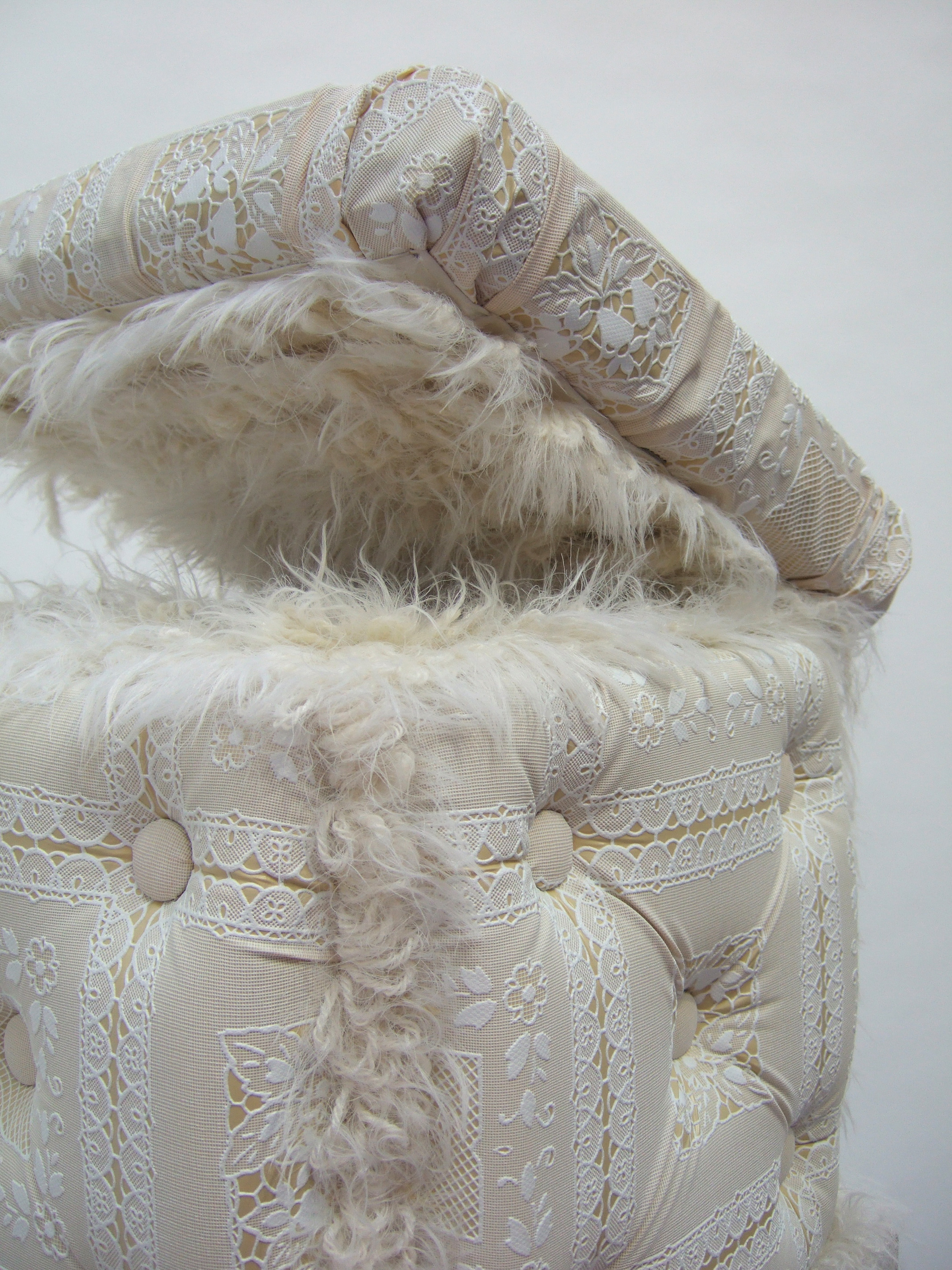 "Made with the zeal of a dressmaker, the combination of fur, satin, lace and vinyl, replete with cream buttons puckered over soft upholstery padding, conspire to create an alluring piece of Rococo fetishism."